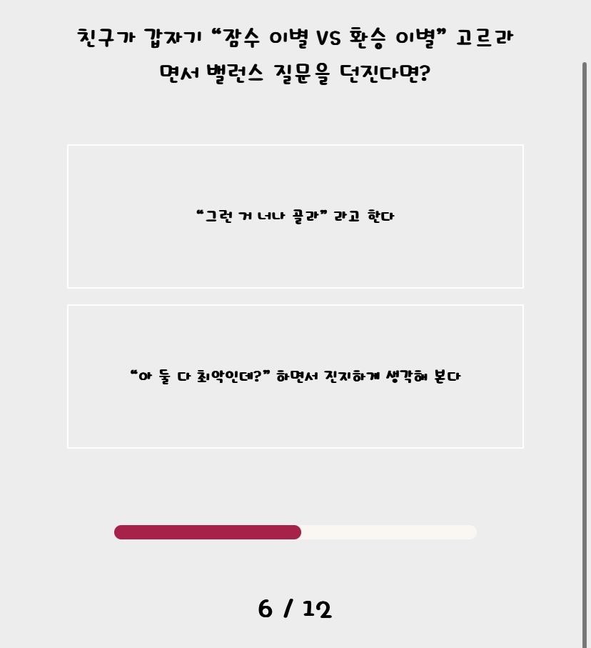 6. 잠수 이별과 환승 이별... 전 골라 줍니다 ㅋㅋㅋㅋㅋ 둘 다 최악인데? 정확히 이 대답부터 시작할 것 같습니다.