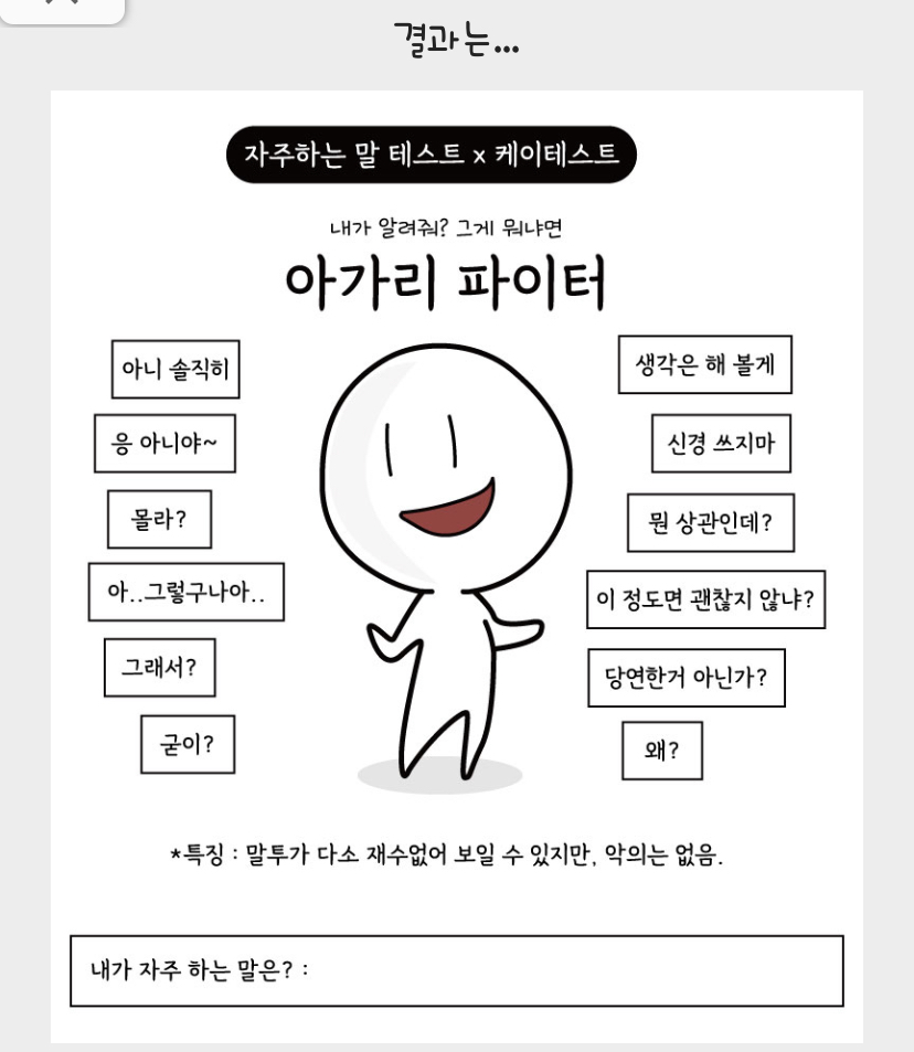자주 하는 말 테스트 (MBTI 테스트 검사) 인데요, 귀여운 캐릭터와 함께 내가 자주 하는 말은 무엇인지 결과를 알려주는 간단한 테스트입니다.