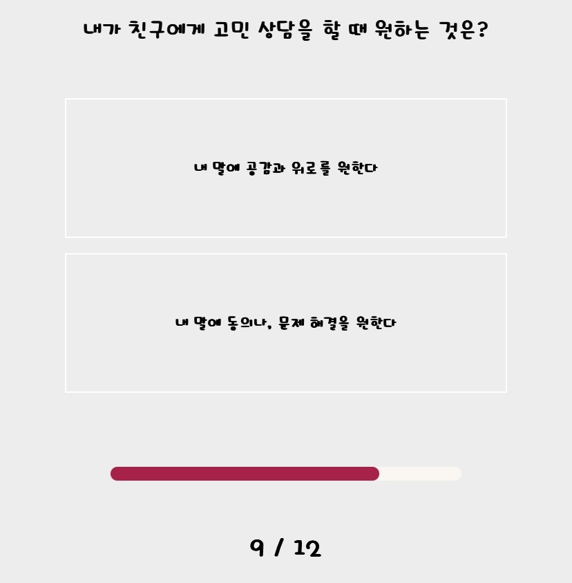 9. 친구 고민 상담은 ㅋㅋㅋㅋ 이게 T인 저의 부족한 점인 것 같은데요... 전 고민을 들으면 공감, 위로는 먼저 생각이 안들고 빨리 그 고민을 해결해주려고 하는 편이에요... 요즘은 사회적으로 억지 공감 대충 해주고 속으로 해결방법을 생각하기도 한답니다. ㅋㅋㅋ