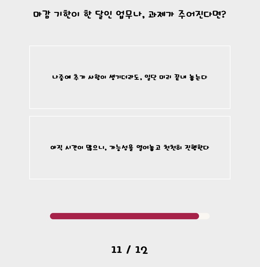 11. 마감 기한이 있는 업무를 한다면 닥쳐서 부랴부랴 하는 걸 싫어하기 때문에 미리미리 조금씩 해놓는 걸 좋아합니다.