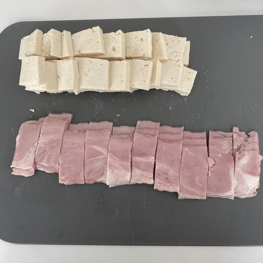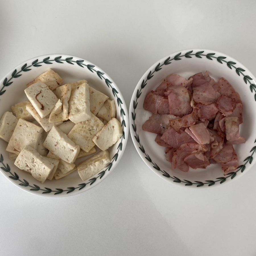 두부, 베이컨도 한 입 크기로 썰어줍니다.
