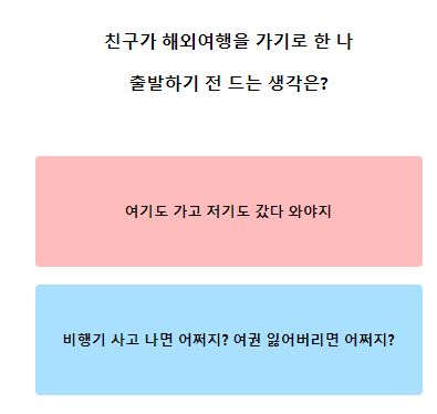 10. 친구랑 해외여행 출발 전에 드는 생각은... 계획할 때 여기도 가고 저기도 갈 건 정했을 거기 때문에! 직전에는 사고 나면 어쩌지 ㅋㅋㅋ망상을 할 것 같습니다. 여권 잃어버릴 걱정 엄~~~~ 청 많이해요 ㅋㅋㅋㅋㅋㅋㅋㅋㅋㅋ