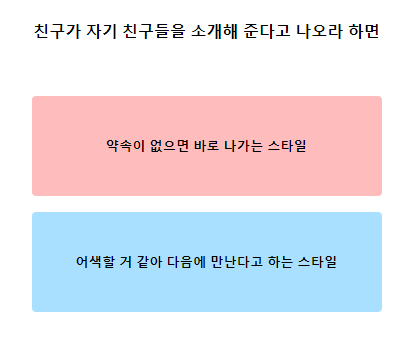 9. 친구가 자기 친구들을 소개해 준다고 나오라고 하면 약속이 없으면 바로 나가는 스타일입니다! 어색하긴 하지만.. 그냥 친구랑 놀려고 나갈 듯