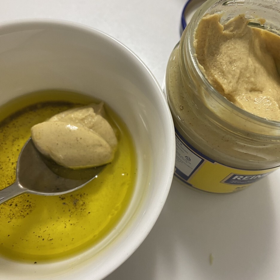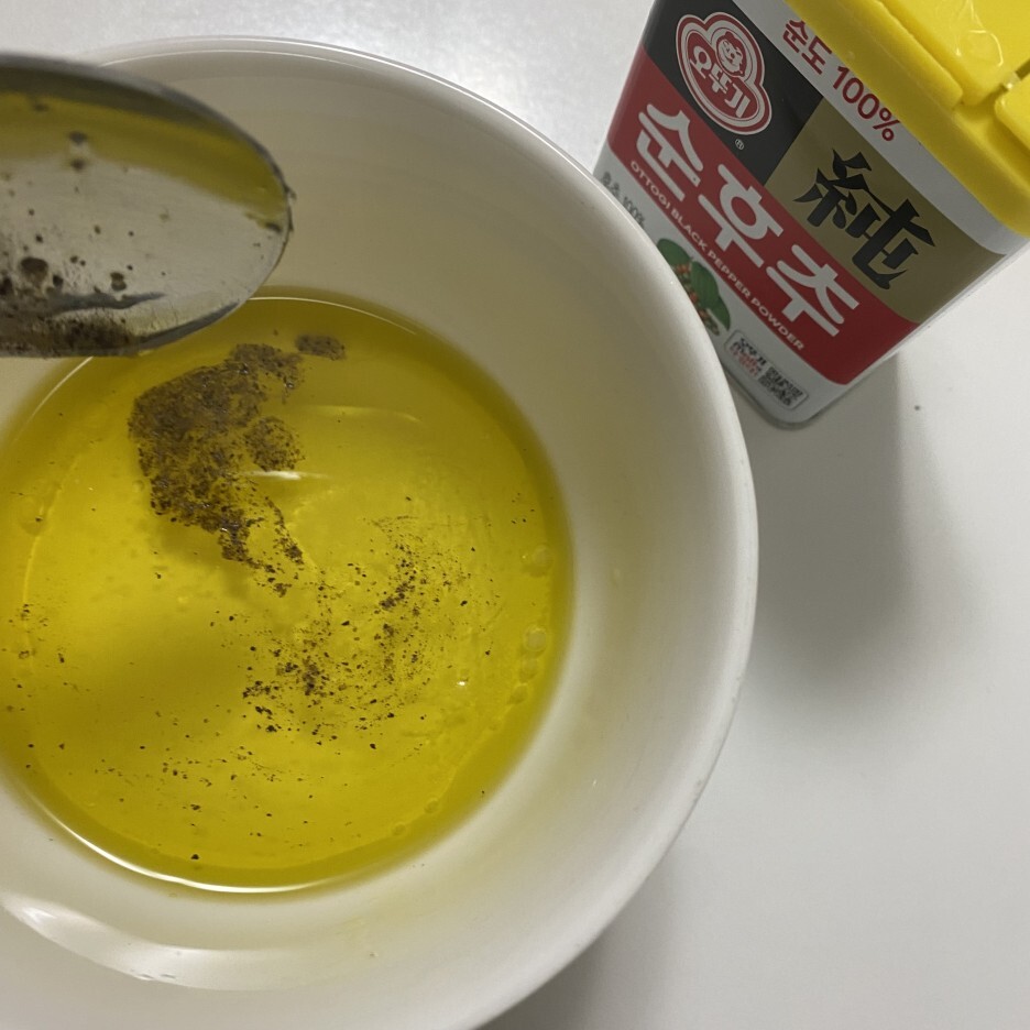 4. 작은 그릇에 올리브 오일 3스푼, 식초 2스푼, 올리고당 2스푼, 소금 약간, 후추 약간, 디종 머스타드 1/2스푼을 함께 넣고 휘저어줍니다.