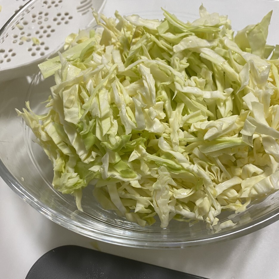 2. 큰 그릇에 잘게 채 썰어준 양배추를 담아줍니다.