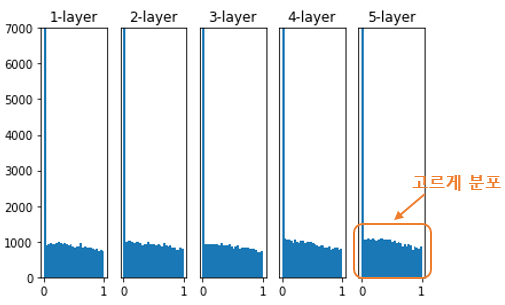 ReLU 일 경우 층이 지날수록 활성값이 고르지 못하게 되는 문제